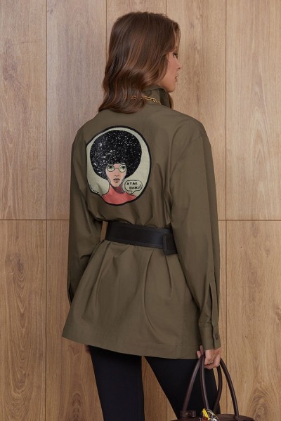 Рубашка прямого силуэта, длиной ниже бедра, выполнена в стиле милитари. Центральная застежка доверху на петли и пуговицы. Накладные фигурные карманы с клапанами на полочках изделия. Спущенная линия плеча, объемный рубашечный рукав. Рукав снизу на притачной манжете. Спинка прямая. На спине авторский принт “Я так вижу”. Рубашечный воротник на стойке.