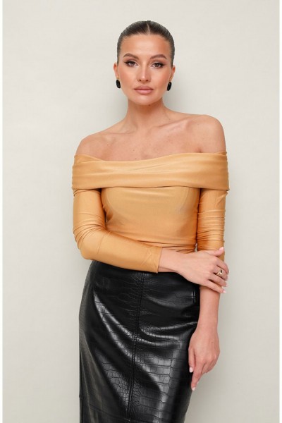 Блуза с открытыми плечами прилегающего силуэта, выполнен из эластичного полотна - бифлекс. По верхнему срезу обработан широкий отворот.
