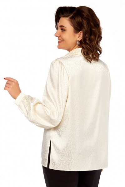 Блузка прямого силуэта, выполнена из ткани типа тонкого атласа с жаккардовым рисунком. Воротник на стойке, застежка на пуговицы, по боковым швам разрезы. Рукав длинный, расширенный, сверху небольшая сборка, внизу тоже сборка + притачная манжета с пуговицей.