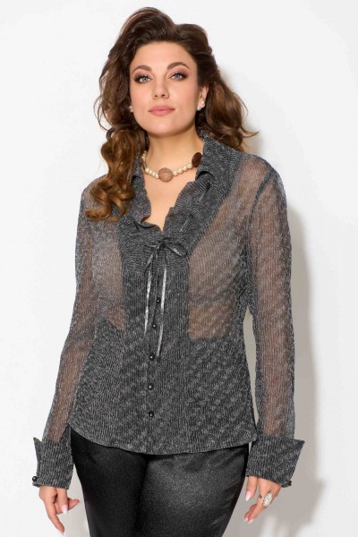 Блузка ""Аста"" нарядная, прилегающего силуэта, выполнена из жатой сетки. По горловине полочки рюша. В рюшу вставлен шнур. Застежка однобортная на навесные петли и пуговицы. Воротник отложной, на стойке, рубашечного типа. Рукав втачной, по низу рукава отложной манжет с застежкой на навесные петли и пуговицы.