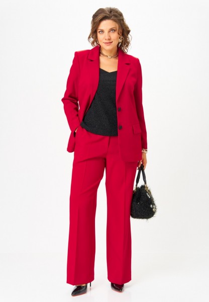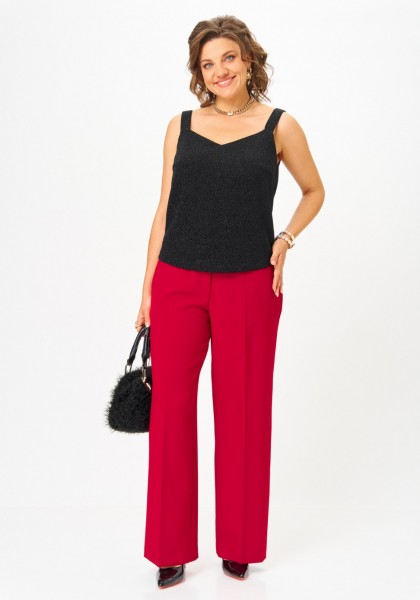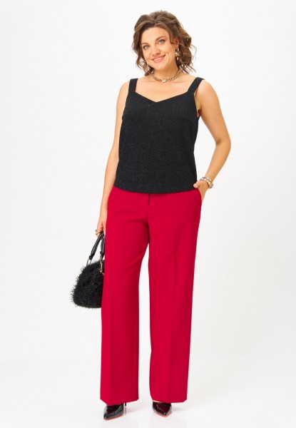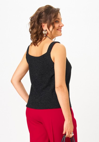 Топ прямого силуэта на широких бретелях, выполнен из трикотажного полотна с люрексом. Перед с нагрудными вытачками. Горловина переда лёгкой V-образной формы. Спинка цельнокроеная.