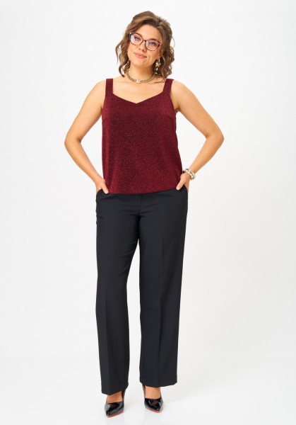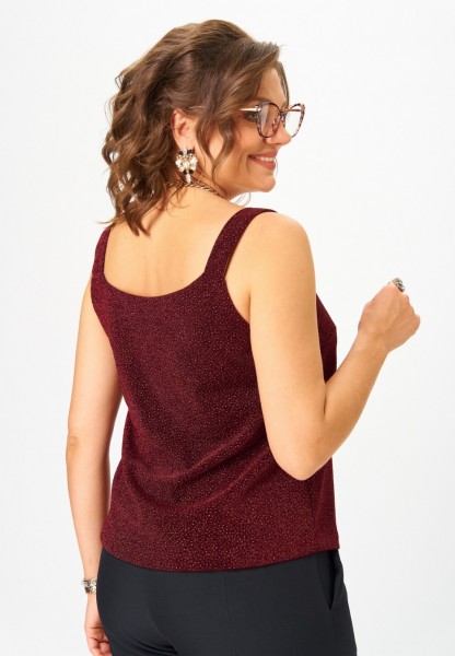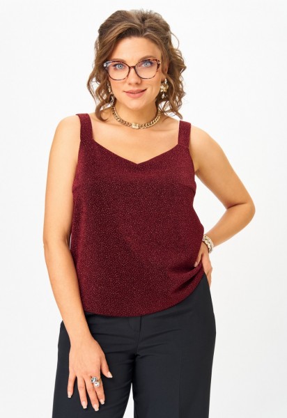 Топ прямого силуэта на широких бретелях, выполнен из трикотажного полотна с люрексом. Перед с нагрудными вытачками. Горловина переда лёгкой V-образной формы. Спинка цельнокроеная.