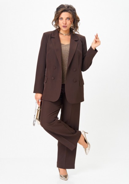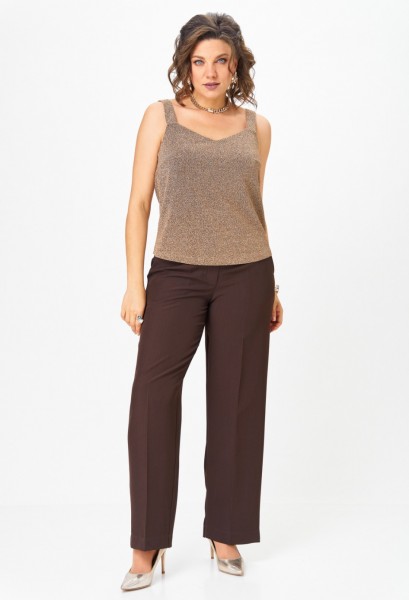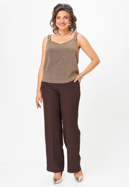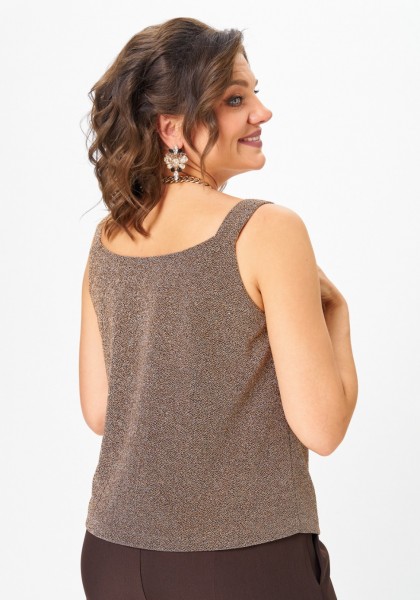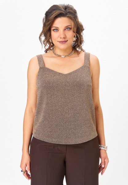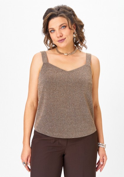 Топ прямого силуэта на широких бретелях, выполнен из трикотажного полотна с люрексом. Перед с нагрудными вытачками. Горловина переда лёгкой V-образной формы. Спинка цельнокроеная.