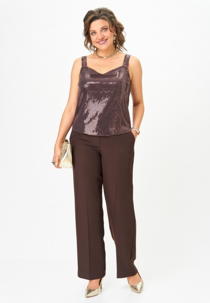 Топ прямого силуэта на широких бретелях, выполнен из трикотажного полотна с мелкими пайетками. Перед с нагрудными вытачками. Горловина переда лёгкой V-образной формы. Спинка цельнокроеная.