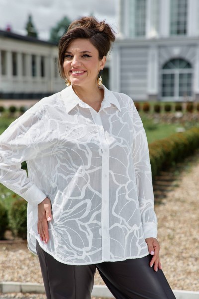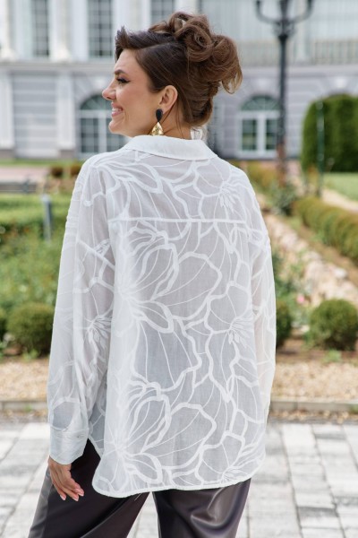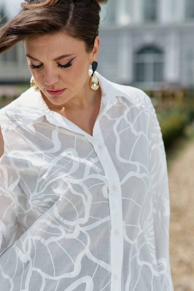 Блузка «оверсайз» с центральной застёжкой на петли-пуговицы по планке, воротником рубашечного типа. Спинка с притачной кокеткой. Линия плеча в блузке спущенная, рукав втачной с притачной манжетой по низу. Низ в блузке фигурной формы. В качестве декоративного отделочного элемента в блузке – отделочные строчки в тон ткани.