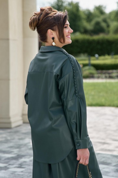 Рубашка— не просто верх, а главный акцент. Кожа, плотная, но податливая, образует «оверсайз» силуэт. Плечо, от места втачивания воротника и до вытачки по рукаву, украшены декоративными косичками из кожаных тесёмок. По переду рубашки застёжка на декоративные пуговицы в тон ткани по планке, и накладные карманы. Воротник рубашечного типа. Линия плеча спущенная. Спинка в рубашке с отрезной кокеткой. Рукав втачной, длинный с локтевым швом и разрезом от низа; заложенной складкой от низа и притачной манжетой. Низ в рубашке ассиметричный.