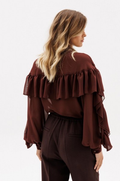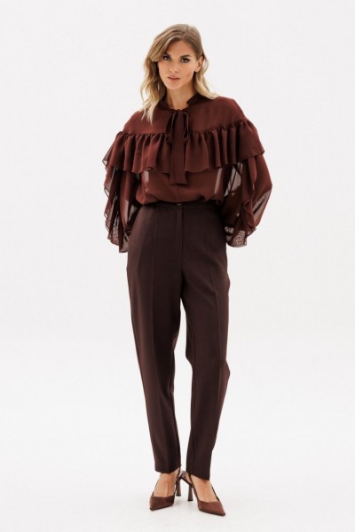 Блузка выполнена из шифона. Блузка прямого силуэта, длиной до линии бедер. Спереди средний шов и кокетка, V-образный вырез и завязки. Ни спинке кокетка. Воротник-стойка. Кокетка переда и спинки переходит на рукав. Рукав двухшовный, расширеный и присборенный к низу. Низ рукава на притачной манжете с застежкой на пуговицы. В боковых швах разрезы. Блузка декорирована оборками из основной ткани по линиям кокеток переда и спинки, и по верхнему шву рукава.
