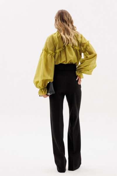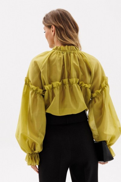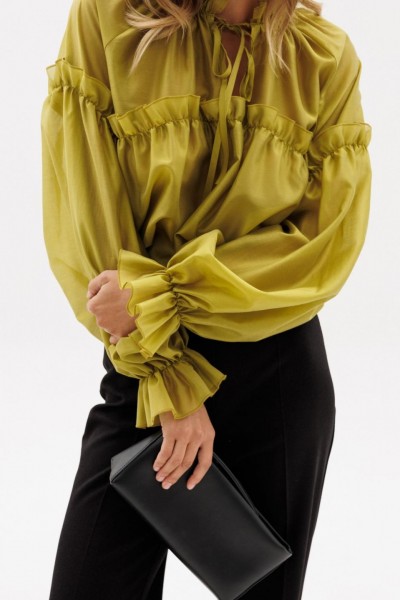 Блузка выполнена из плательно-блузочной ткани. Блузка прямого силуэта, длиной до линии бедер. Спереди и по спинке средний шов и кокетки со сборками от них. Рукав реглан, расширенный к низу. Блузка декоррирована оборками из основной ткани по линиям кокеток переда и спинки, и по верхнему шву рукава.
