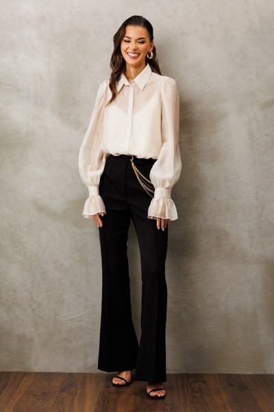 Блузка из креп-шифона с напылением. Прямого силуэта, с втачным рукавом вверху со сборкой внизу на манжете с застежкой на петлю-пуговицу и рюшей на манжете. Полочка с центральной застежкой на петли-пуговицы на цельнокроеной планке. Воротник рубашечный отложной на стойке. Внизу по боковым швам обработаны разрезы. К блузке идет в комплект атласный топ на регулируемых бретелях прямого силуэта, на широкой обтачке. Полочка с V-образным вырезом и нагрудной вытачкой.