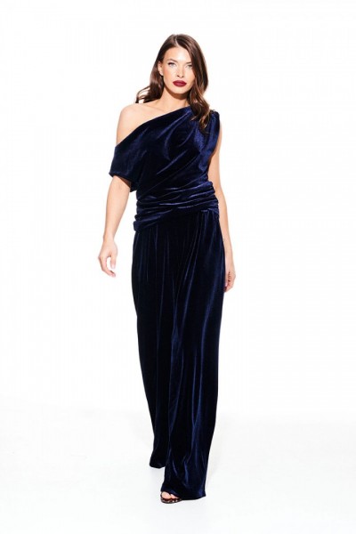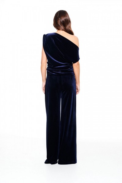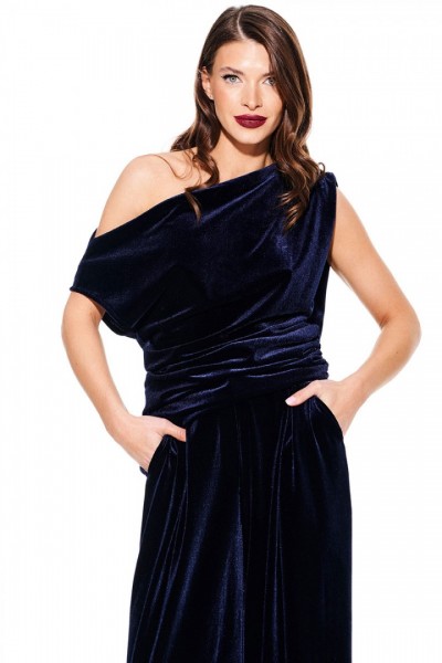 Блуза из бархата на трикотажной основе, умеренного объема, полуприлегающего силуэта с акцентом на одно плечо, с фигурной драпировкой на уровне груди. Вырез горловины в форме лодочки. Левый плечевой и боковой шов оформлены сборкой. Длина до линии бедер.