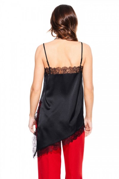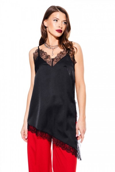 Блузка из струящейся ткани с блеском, с асимметричной линией низа, отделкой из кружева, на тонких регулируемых бретелях. Перед с V-образным вырезом горловины и нагрудными вытачками. В левом боковом шве фигурный разрез. Горловина, линия низа и разрез оформлены тесьмой из кружева.