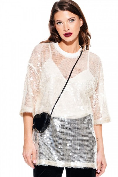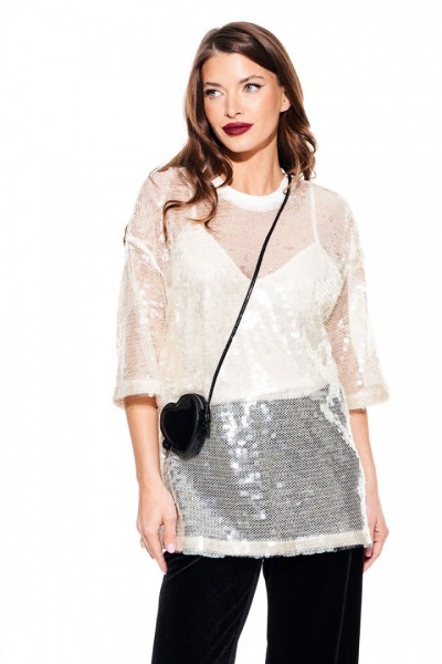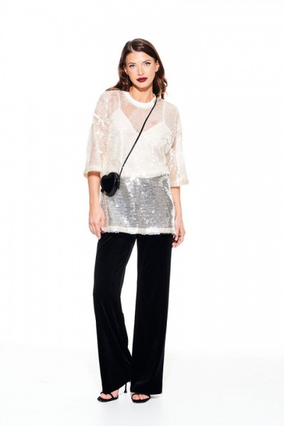 Блузка из различных материалов. Верхняя блузка из трикотажного полотна в пайетки, прямого силуэта, свободная, с круглым вырезом горловины. Перед и спинка цельные. Вырез горловины обработан довязом. Нижняя блузка выполнена из струящейся ткани с блеском, прямого силуэта, с V-образным вырезом горловины, на регулируемых бретелях. Перед с нагрудными вытачками. Спинка цельная.