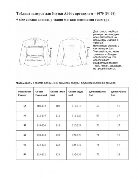 На модели — размер блузки - 58, рост фотомодели - 170 см. Размерный российский ряд: 54–64.