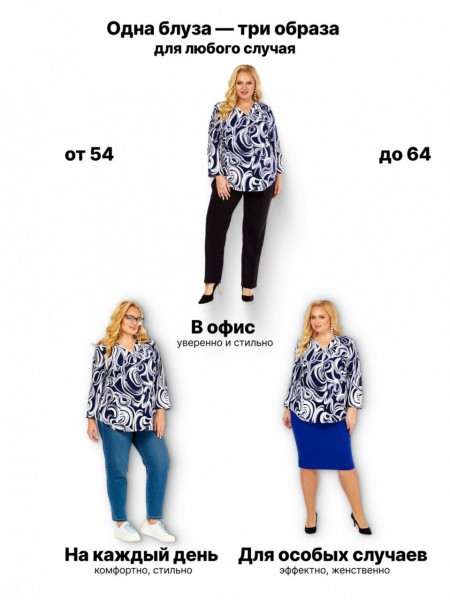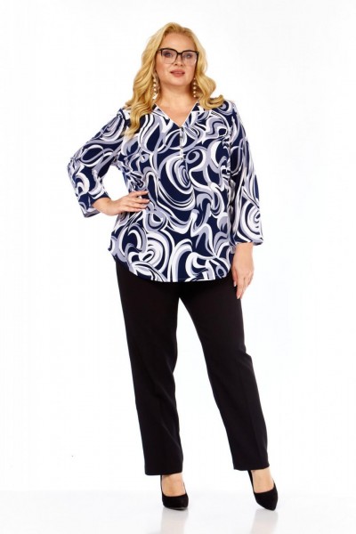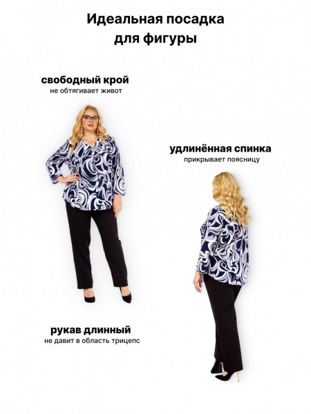 Динамичный сине-серо-белый принт с абстрактными мотивами моментально приковывает взгляд, стройнит силуэт и легко комбинируется как с классическими черными брюками, так и с юбками.