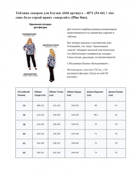 Уважаемые покупательницы, обратите внимание на то, что начиная с 60-го размера, блузки могут немного «большемерить». Это обеспечивает дополнительный комфорт и свободу облегания. Сама ткань эластична и хорошо тянется.