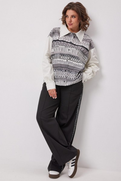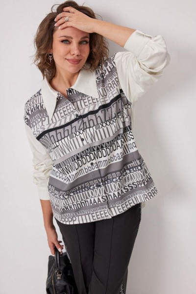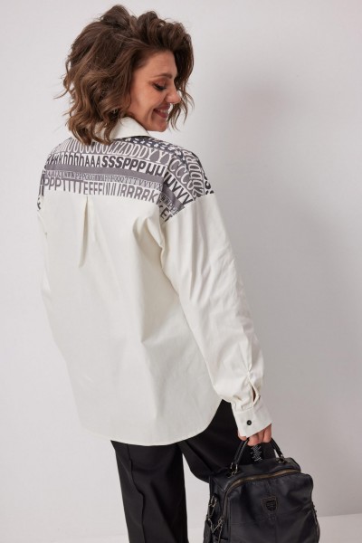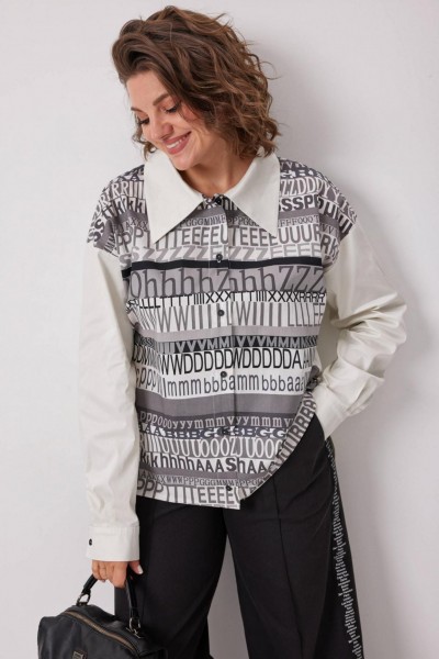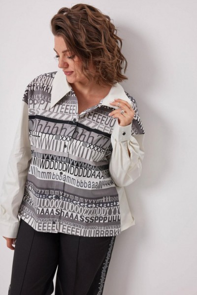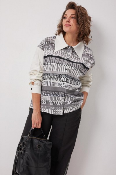 Если Вы ищете что-то особенное и эффектное, что подчеркнёт Вашу индивидуальность, эта блуза именно то, что нужно! Блуза выполнена из сочетания однотонного и принтованного хлопкового текстиля. Стильный текстовый принт добавит индивидуальность в повседневный образ и сделает его запоминающимся! Блуза свободного кроя с отложным воротником на планке с застёжкой на петли – пуговицы контрастного цвета. Рукав со спущенной проймой на манжете. Спинка на кокетке со встречной складкой. Низ спинки имеет фигурную форму. К модели идеально подходят брюки арт. 6069, брюки арт. 6068.
