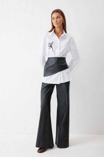 Блузка полуприлегающего силуэта. На уровне талии расположена кулиска с и завязками для регулирования степени прилегания. По центру супатная застежка, воротник рубашечный стояче-отложной. Рукав втачной. В верхней части полочки расположен накладной карман с дизайнерской печатью.