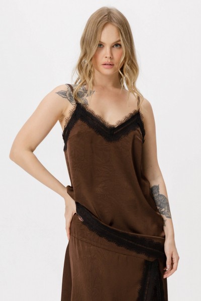 Детали: прямой силуэт, нагрудные вытачки, фигурный вырез по переду, отделка кружевом по верхнему и нижнему краю топа, регулируемые бретели.