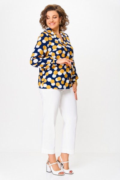 Блузка женская прямого силуэта из вискозной ткани с центральной застёжкой на петли и декоративные пуговицы. Полочки с нагрудными вытачками, спинка цельная. Воротник отложной с лацканами пиджачного типа. Рукав втачной одношовный, внизу со сборкой и притачной манжетой, которая застёгивается на петлю и декоративную пуговицу.