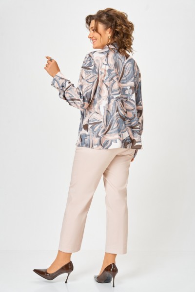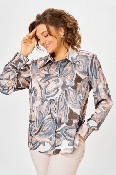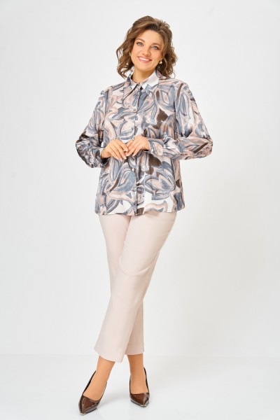 Блузка из нежной ткани «армани», имитирующей шёлк, прямого силуэта с центральной застёжкой на петли и декоративные пуговицы. Перед с нагрудными вытачками. Спинка цельная. Воротник рубашечного типа с отрезной стойкой. Рукав втачной одношовный с манжетой, которая застёгивается на две петли и пуговицы. Длина по спинке р.50,52,54 – 63 (+/- 1) см, р.56,58,60 – 66 (+/-1) см, длина рукава – 66 (+/-1) см.