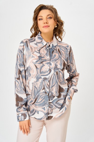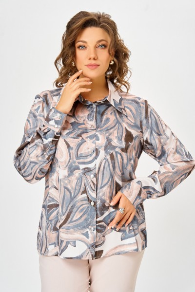 Блузка из нежной ткани «армани», имитирующей шёлк, прямого силуэта с центральной застёжкой на петли и декоративные пуговицы. Перед с нагрудными вытачками. Спинка цельная. Воротник рубашечного типа с отрезной стойкой. Рукав втачной одношовный с манжетой, которая застёгивается на две петли и пуговицы. Длина по спинке р.50,52,54 – 63 (+/- 1) см, р.56,58,60 – 66 (+/-1) см, длина рукава – 66 (+/-1) см.