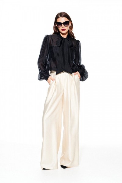 Брюки свободного объема, расширенные к низу. На передних половинках выполнены боковые карманы с отрезным бочком и встречные складки. На задних половинках талиевые вытачки. Застежка – гульфик на молнии. Пояс притачной, с резинкой по спинке, застежкой на крючок и потайную пуговицу.