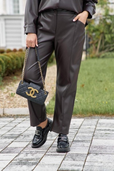 Брюки прямого силуэта из кожи с рельефами и отстрочкой по переду. По переду застежка на тесьму молнию в гульфике и пуговицу в поясе. По переду брюк наклонные карманы. Пояс притачной со вставкой эластичной тесьмы резинки в «бочках», что обеспечивает комфортную посадку на фигуру.
