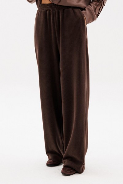 Брюки выполнены из вельвета. Брюки прямого покроя длиной в пол, на притачном поясе с эластичной тесьмой. Спереди боковые карманы с наклонным входом.