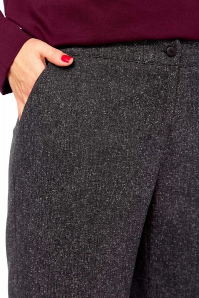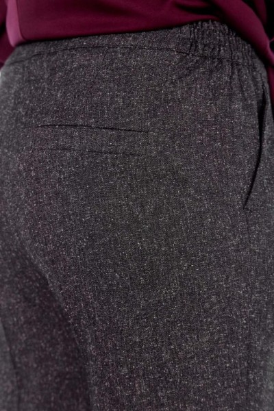 Брюки женские, выполнены из костюмной ткани, пояс притачной частично на резинке. Застежка на тесьму-молнию и петлю-пуговицу. В брюках обработаны карманы.