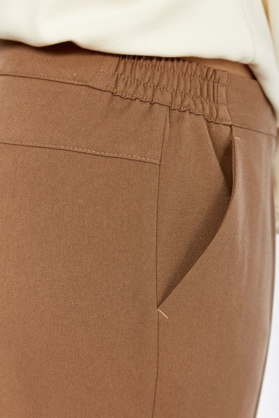 Брюки женские классические из костюмной ткани. В брюках обработан пояс, частично на резинке. Застежка на молнию, петлю и пуговицу. В брюках обработаны боковые карманы. На задней части брюк — кокетка.
