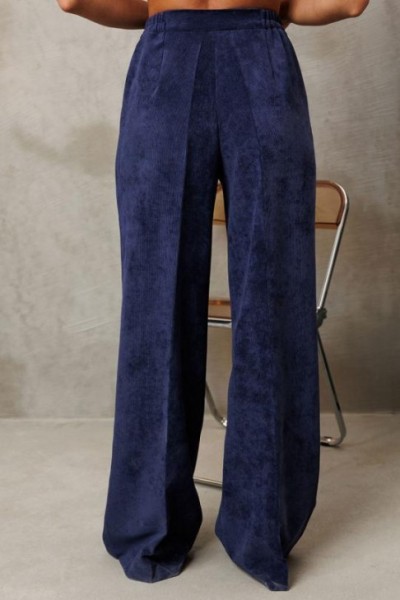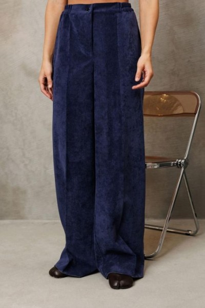 Брюки палаццо с притачным поясом из мягкой вельветовой ткани. Спереди застежка гульфик на молнии и петлей и пуговицей по поясу. По задней частям брюк вытачки. Пояс с резинкой в боковых частях. Брюки с заутюженными стрелками.