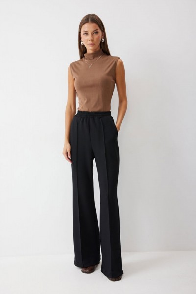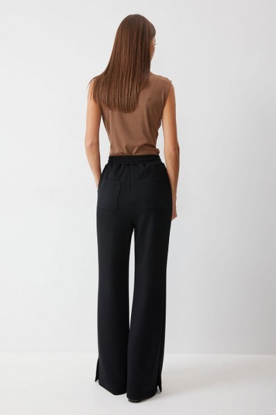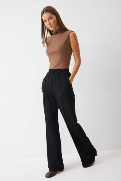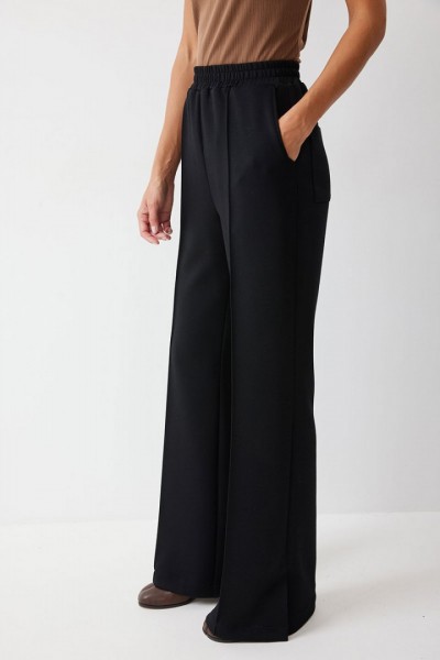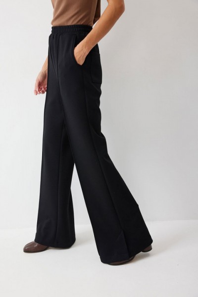 Брюки прямого силуэта из трикотажного полотна. По верху брюк притачной пояс на резинке. На передних половинках брюк обработаны карманы и защипы. На задних – карманы. По низу внешнего шва брюк шлицы.