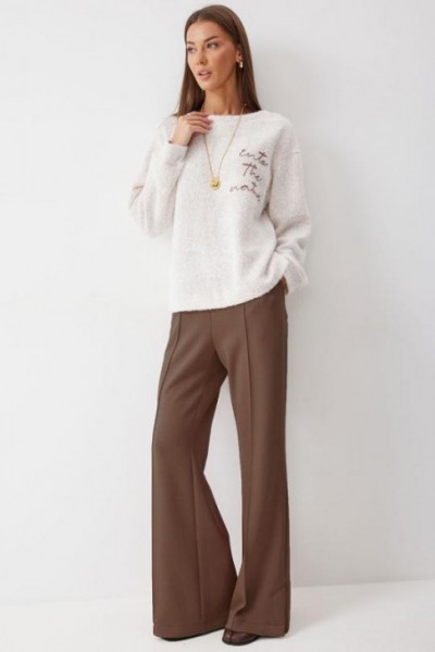 Брюки прямого силуэта из трикотажного полотна. По верху брюк притачной пояс на резинке. На передних половинках брюк обработаны карманы и защипы. На задних – карманы. По низу внешнего шва брюк шлицы.