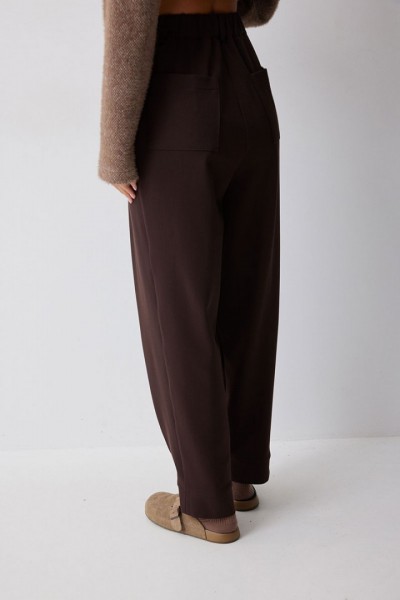 Брюки из костюмной ткани, зауженные книзу. По верху брюк притачной пояс с застежкой на петлю и пуговицу и шлевками для ремня. По поясу задних половинок брюк резинка. На передних половинках обработаны боковые карманы и застежка молния в среднем шве. По верху и низу брюк расположены встречные складки. По низу брюк – манжеты. На задних половинках накладные карманы.
