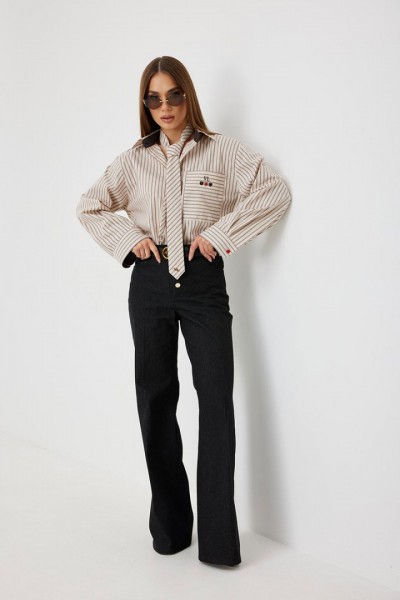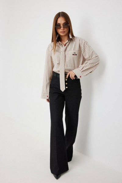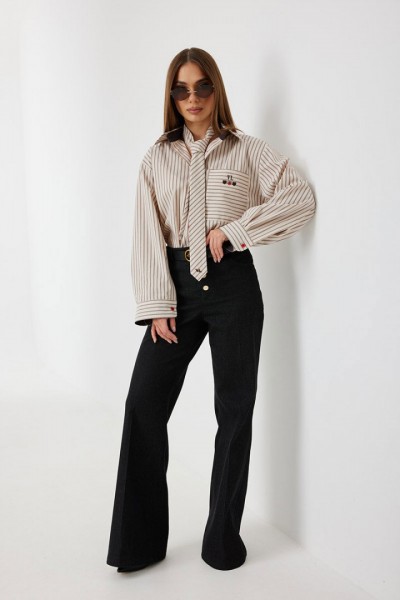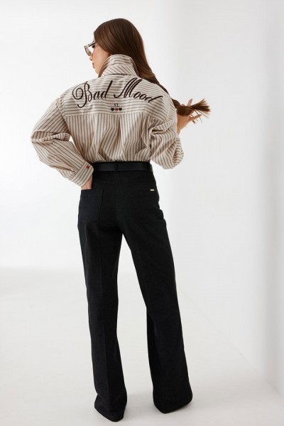 Брюки клёш из джинсовой ткани. Верх на притачном поясе со шлёвками. Высокая посадка. Застёжка спереди на петли и пуговицы-болты. По переду боковые карманы. По задней части кокетка и накладные карманы. Отделка контрастной нитью.
