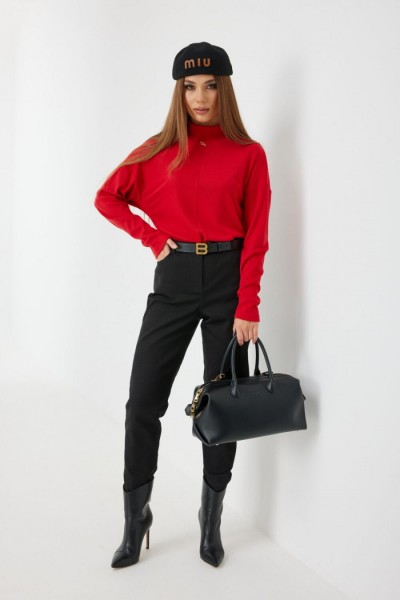 Средняя посадка, пояс притачной, застежка спереди на молнию и джинсовую пуговицу. По переду боковые карманы, сзади под кокеткой накладные карманы. Внутренний пояс и отвороты по низу брюк красного цвета.