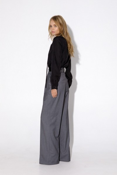 Детали: высокая посадка, широкие и длинные брюки, притачной пояс со шлевками, передние половины с небольшими застроченными мягкими складками и заутюженными стрелками, застежка на молнию и пуговицу, боковые карманы.
