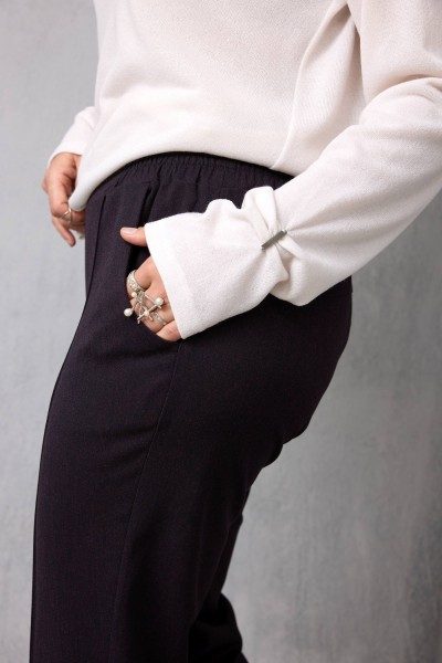 Пояс притачной, на эластичной резинке. По передней части на поясе выполнен «островок», что позволяет визуально скрыть животик. Для Вашего удобства выполнены карманы хулиганы. В боковых швах карманы «Хулиганы». Притачная кокетка по задней части, позволяет грамотно создавать нужные линии, что делает посадку брюк идеальной. Низ брюк обработан классическим способом в подгибку.