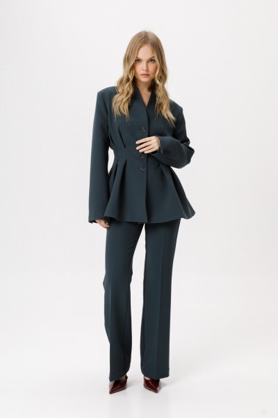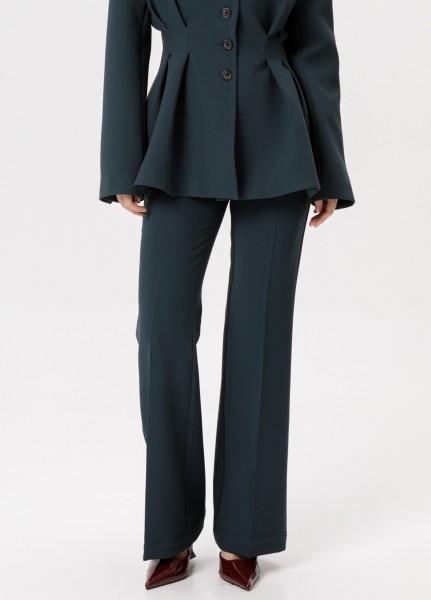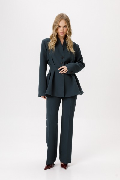 Детали: притачной пояс со шлевками, передние половины с заутюженными стрелками, застежка на молнию и потайные крючки, боковые карманы. Задние части брюк с вытачками и заутюженными стрелками. Пояс брюк без резинки.