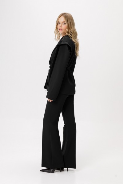 Детали: притачной пояс со шлевками, передние половины с заутюженными стрелками, застежка на молнию и потайные крючки, боковые карманы. Задние части брюк с вытачками и заутюженными стрелками. Пояс брюк без резинки.