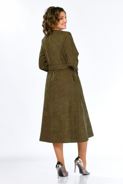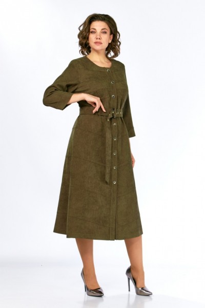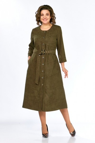 Платье женское А-силуэта из штруксовой ткани в длине миди. Перед с округлым вырезом и центральной застежкой на петли-пуговицы. В боковых швах функциональные карманы. Спинка с кокеткой и средним швом. Перед и спинка платья оформлены косыми подрезами по всей длине изделия. Рукав одношовный втачной, снизу на притачной манжете. Платье дополняет съемный пояс с декоративной пряжкой.