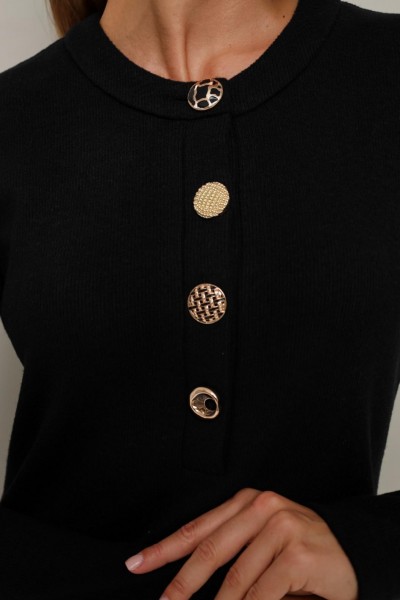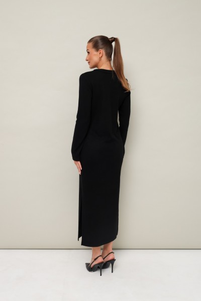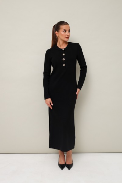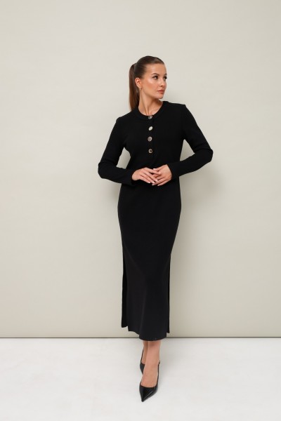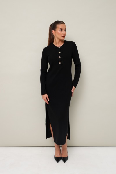 Стильное платье полуприлегающего силуэта, выполнено из трикотажного полотна. Горловина округлой формы, с центральной застежкой на петли и 4 разных пуговицы. Рукава длинные втачные. В боковых швах обработаны высокие