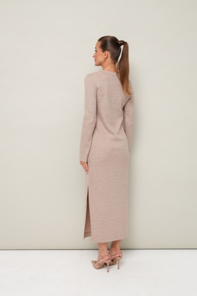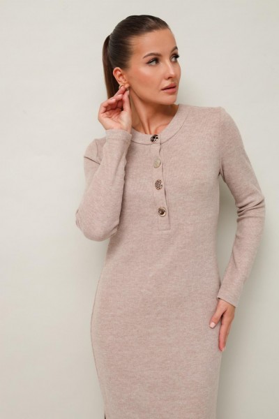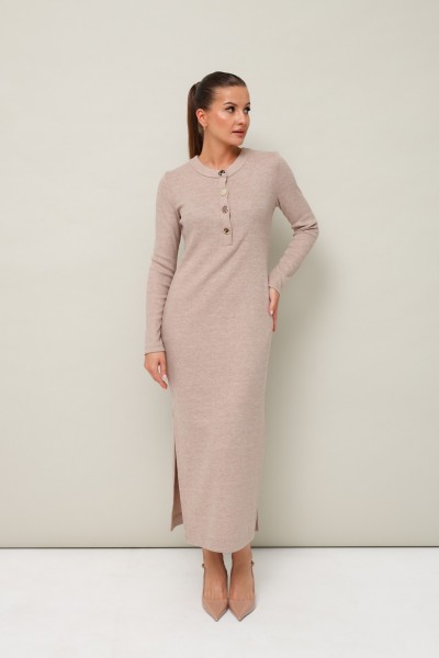 Стильное платье полуприлегающего силуэта, выполнено из трикотажного полотна. Горловина округлой формы, с центральной застежкой на петли и 4 разных пуговицы. Рукава длинные втачные. В боковых швах обработаны высокие