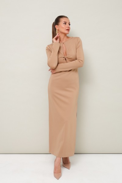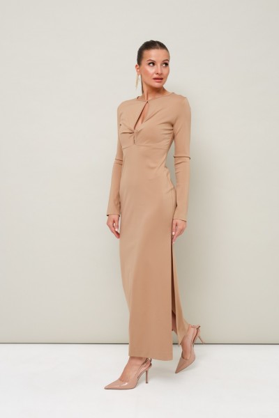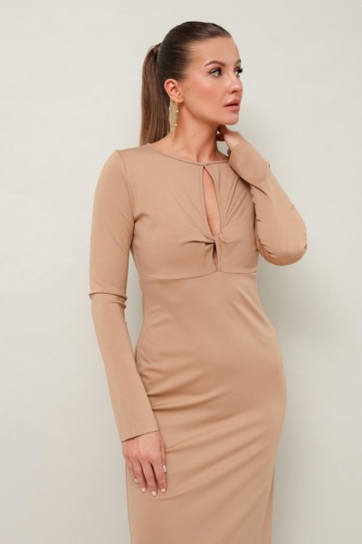 Элегантное миди-платье бежевого оттенка издано для создания изысканных образов. Модель выполнена из высококачественного эластичного трикотажа, что обеспечивает отличную посадку и комфорт при носке. Дизайн платья включает округлую горловину с эффектным вырезом "капля", придающим образу легкую игривость. Особое внимание уделено лифу, где присутствует изящный декоративный узел с подрезом, акцентирующий линию груди. Длинные втачные рукава дополняют строгий силуэт, а высокий разрез в боковом шве добавляет платью изысканности и свободы движений. Спинка оформлена средним швом, подчеркивая элегантность модели. Это платье идеально подойдет для торжественных мероприятий, обеспечивая не только стиль, но и удобство.