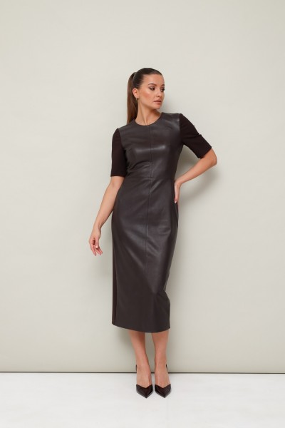 Стильное платье-футляр отрезное по линии талии, выполнено из экокожи и трикотажного полотна. Горловина округлой формы. Короткие втачные рукава. Застёжка по спинке в среднем шве на потайную молнию. Для удобства движения сзади обработан разрез.