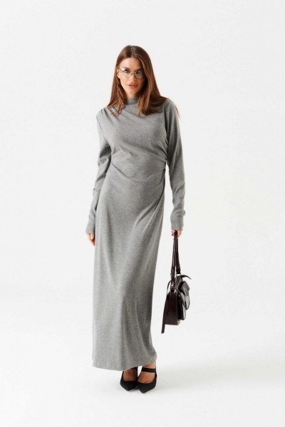 Платье женское из трикотажного полотна, длинное, прилегающего силуэта. По переду – драпировка, выходящая из правого плечевого шва и уходящая в левый боковой шов. В правом боковом шве сборка на резинку. По горловине цельнокроеная стойка, обработаная обтачкой. Рукав втачной, длинный.