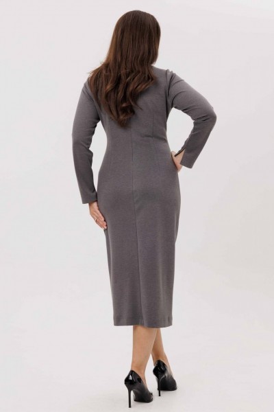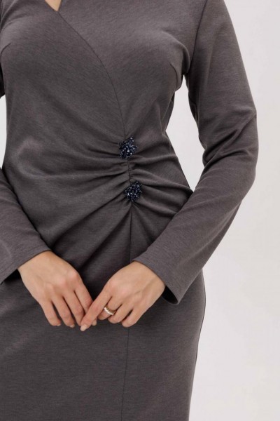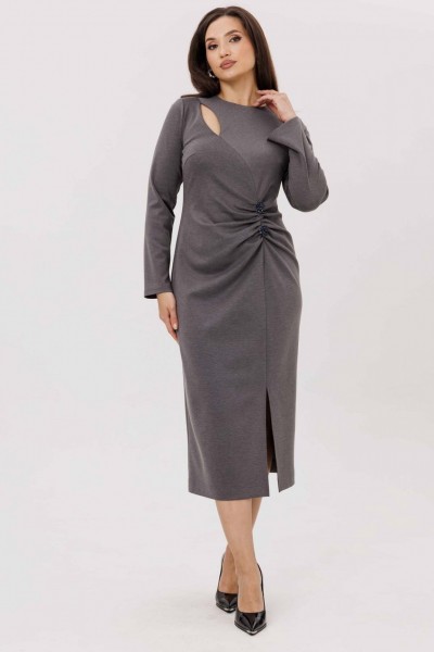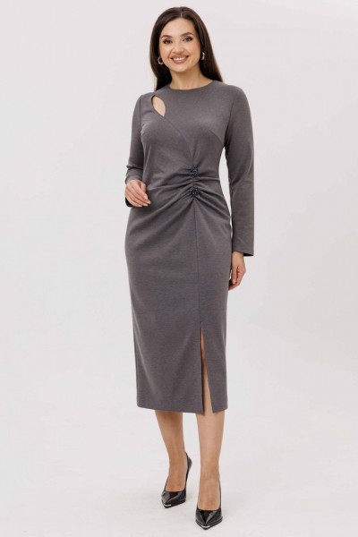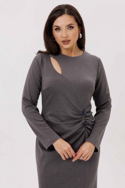 Элегантное серое платье средней длины идеально подходит для деловых встреч и вечерних мероприятий. Модель выполнена в полуприлегающем силуэте с интригующим ассиметричным фигурным подрезом, который начинается с фигурного выреза и украшен сборкой посередине. Элементы дизайна включают нагрудные вытачки на передней части, талиевые вытачки и центральный шов на спинке с вставленной тесьмой-молнией. Рукава платья одношовные, втачные, добавляющие строгости образу. Особый акцент — декоративные броши, пришитые к платью, придающие ему изысканность и уникальность.