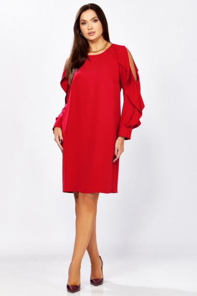 Романтичное платье прямого силуэта, без подкладки. Округлый вырез горловины обработан бейкой. Перед с нагрудной вытачкой. Рукав реглан с вырезом и двумя рюшами. Рукав с манжетой по низу. застегивается на 2 пуговицы и петли. Спинка со средним швом и вырезом «капелька» с завязками на концах с наконечниками. Имеется съемный пояс-завязки с кольцом и наконечниками на концах. Длина рукава от горловины- 69см, длина по синке-97см.