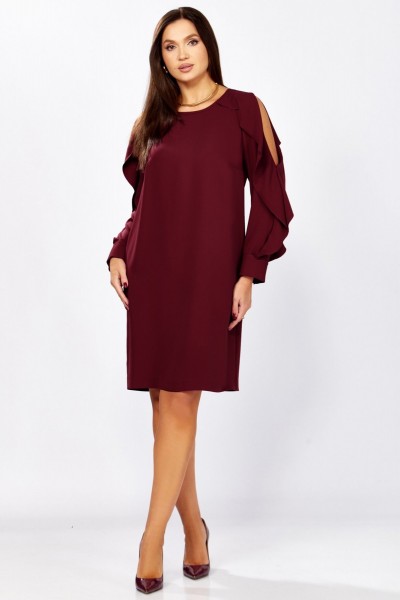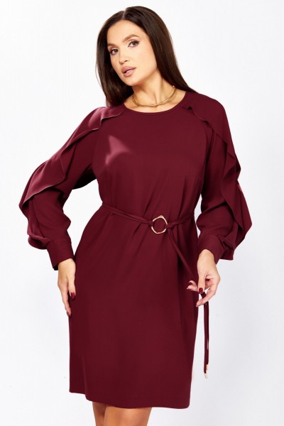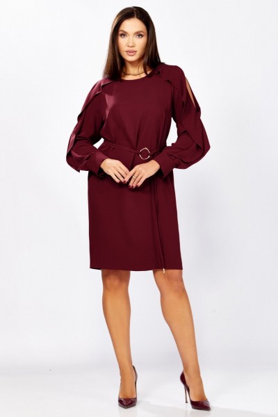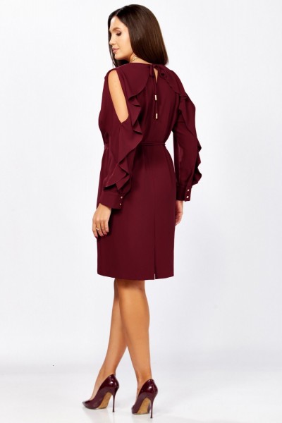 Романтичное платье прямого силуэта, без подкладки. Округлый вырез горловины обработан бейкой. Перед с нагрудной вытачкой. Рукав реглан с вырезом и двумя рюшами. Рукав с манжетой по низу. застегивается на 2 пуговицы и петли. Спинка со средним швом и вырезом «капелька» с завязками на концах с наконечниками. Имеется съемный пояс-завязки с кольцом и наконечниками на концах. Длина рукава от горловины- 69см, длина по синке-97см.