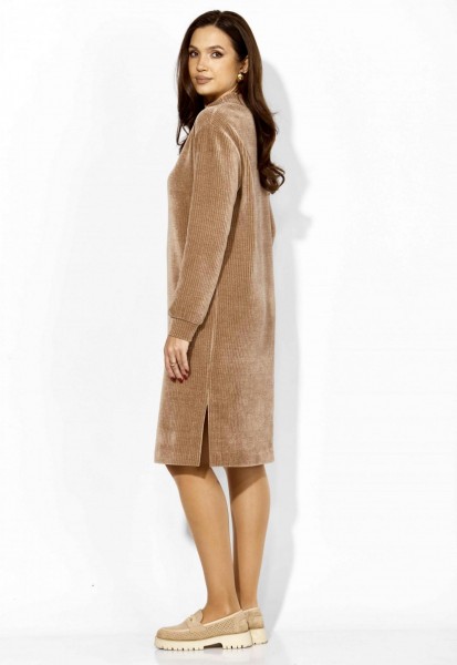 Платье женское, прямого силуэта с длинным рукавом. Рукав со спущенной линией плеча, по низу на манжете. Горловина оформлена высокой, мягкой стойкой. По боку разрез, акцентирован декоративной сточкой. Спинка без особенностей.
